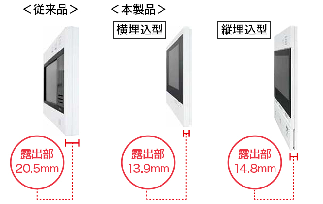室内の住宅情報盤は、スピーカー孔を本体下部に配置し、液晶画面と本体の段差をなくしたフラットなデザインです。奥行は、約14~15ミリ未満というスマートさ。